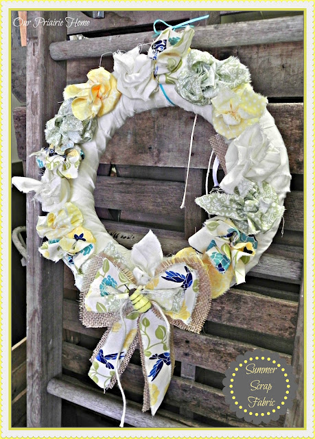 7. Make a fabric rosette out of scrap fabric. For this rosette, I knotted one end of the fabric and rolled the fabric around the knot, glueing every half turn or so. Adhere the rosette with the Fabri-Tac.
